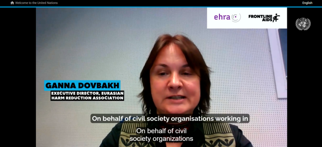 The intervention on behalf of civil society organisations was delivered by Ganna Dovbakh, Executive Director of EHRA, and coordinated with Frontline AIDS and the Alliance for Public Health.